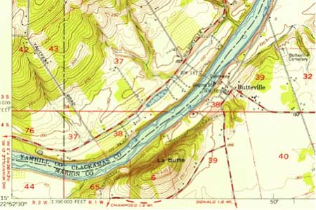 Butteville is a town located on the Willamette River in north French Prairie, the northern end of the Willamette Valley in Oregon. In the late 1800's Butteville was the major port town on the upper Willamette River (between Willamette Falls and the end of navigable waters where the Santiam River joins), and was a thriving agricultural and shipping community. The principal agricultural crops grown in French Prairie were wheat and hops. For a time, Butteville was the “hops capital” of Oregon.