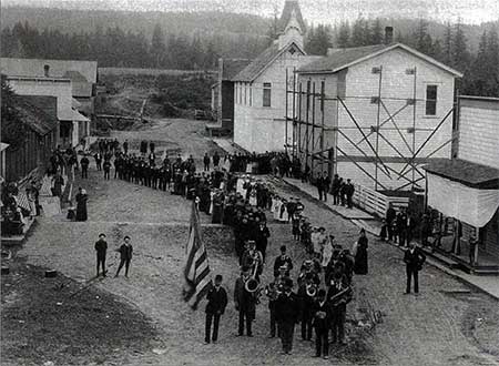 July 4th Parade at Butteville, 1904. Note Butte Road running past The Butteville Store, Odd Fellow Hall, Masonic Temple and on down to the river.
